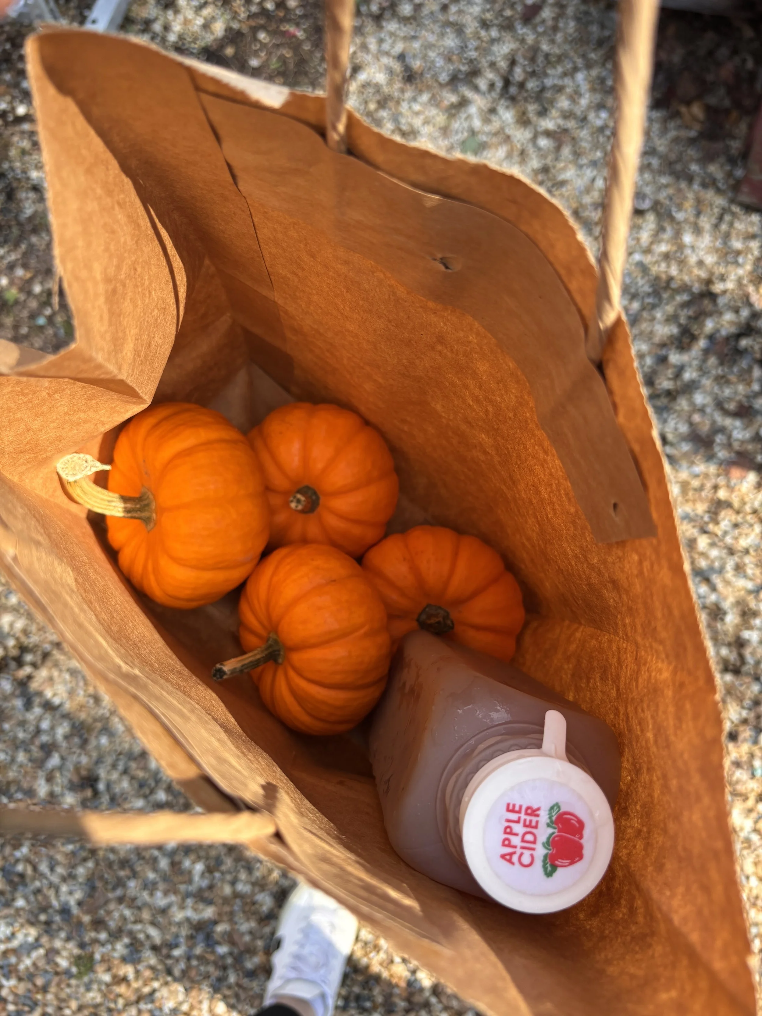 A lover of small pumpkins, Bailey is taking Fall by surprise and jumping on the pumpkin picking early. She coupled her finds with some homemade apple cider and brought a cutie pumpkin bagel with her too!